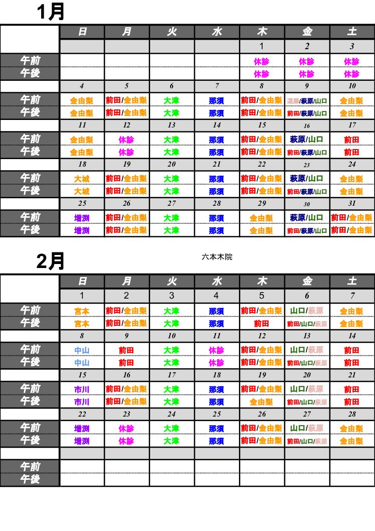 2026年1月6日 / 最終更新日 : 2026年1月22日 caloo-admin お知らせ 1月、2月 日別診察担当医表の掲載 1月1日・1月2日・1月3日・1月12日・2月11日は終日休診になります。 ※クリニック都合により急遽診察担当の変更がございます。ご了承の程よろしくお願い致します。 ご不明な点等ございましたらお問い合わせください。