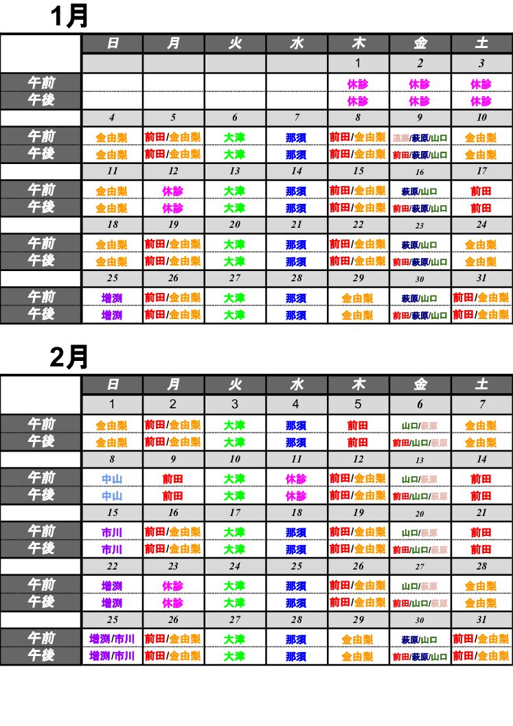 2026年1月6日 / 最終更新日 : 2026年1月6日 caloo-admin お知らせ 1月、2月 日別診察担当医表の掲載 1月1日・1月2日・1月3日・1月12日・2月11日は終日休診になります。 ※クリニック都合により急遽診察担当の変更がございます。ご了承の程よろしくお願い致します。 ご不明な点等ございましたらお問い合わせください。